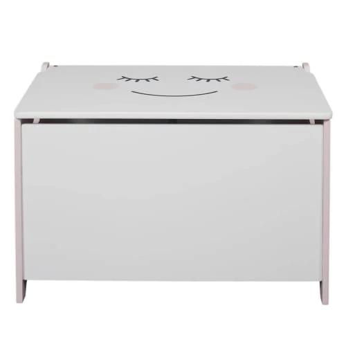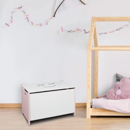 Coffre à Jouets Enfant avec Poignées Smile.Ne laissez plus les affaires de votre enfant trainer partout dans la maison. Ce coffre pour enfant équipé de poignées est doté d’une belle capacité de rangement, et est sublimé par un motif souriant du plus bel effet.Structure en MDF coloris blanc et rose. Finition motif sourire coloris noir et rose.Dimensions : 60 x 36.5 x H39 cm